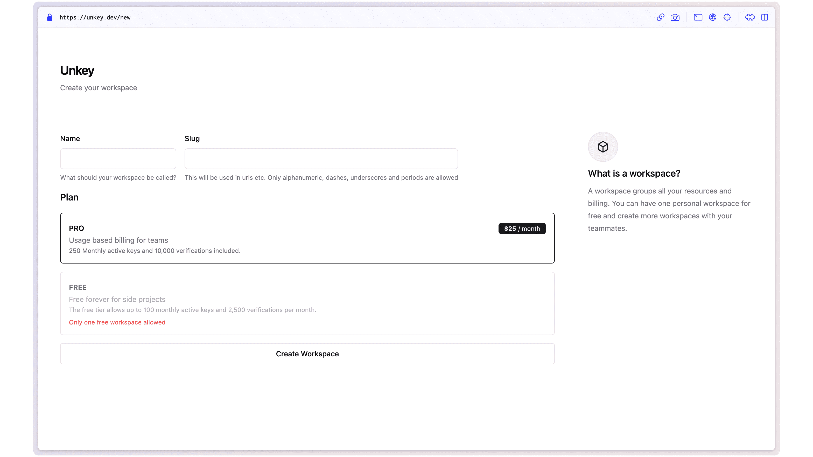 To create a new team, log into the Unkey admin dashboard, and select create workspace. Once you create your team, you need to upgrade the workspace to the pro tier. Once you have upgraded the workspace you can invite your entire team to Unkey.
